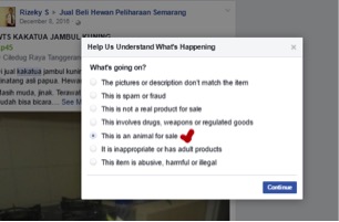 2. Setelah itu akan muncul opsi alasan pelaporan yang dibuat, pilih opsi “This is an animal for sale”