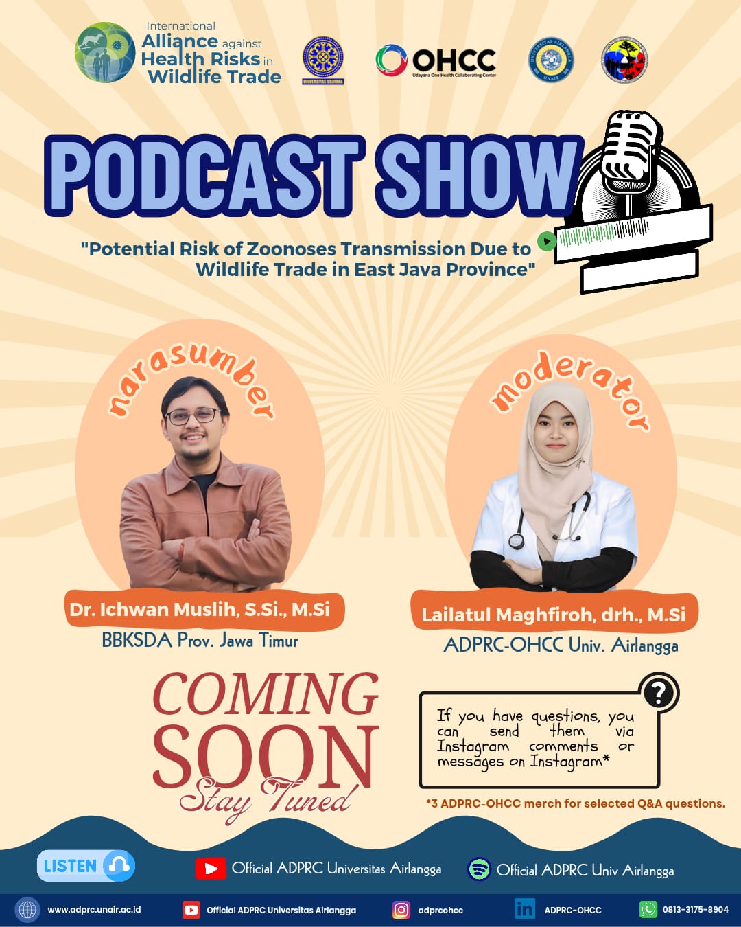 Dalam upaya meningkatkan kesadaran masyarakat terhadap bahaya zoonosis akibat perdagangan satwa liar, Universitas Airlangga melalui Airlangga Disease Prevention and Research Center – One Health Collaborating Center (ADPRC–OHCC) bekerja sama dengan Pusat Kajian One Health Universitas Udayana (Udayana OHCC) menyelenggarakan Podcast edukatif yang berlangsung pada Kamis, 23 Januari 2025.