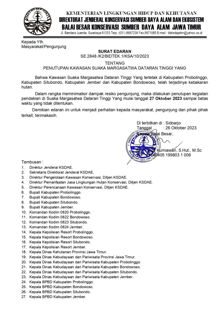 Kebakaran hutan melanda Kawasan Suaka Margasatwa Dataran Tinggi Yang terletak di 4 kabupaten, masing-masing Kabupaten Probolinggo, Kabupaten Situbondo, Kabupaten Jember dan Kabupaten Bondowoso. Untuk meminimalisir dampak resiko bagi pengunjung, maka BBKSDA Jawa Timur menutup kawasan yang lebih dikenal dengan Gunung Argopuro tersebut untuk kegiatan pendakian mulai tanggal 27 Oktober 2023 hingga batas waktu yang tidak ditentukan.