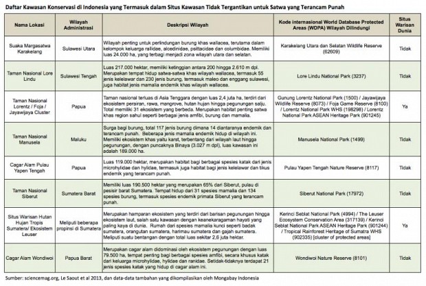 Indonesia berada di daftar peringkat teratas untuk perlindungan wilayah “tidak tergantikan” yang harus dilindungi karena keterancaman dan endemisitas spesiesnya.