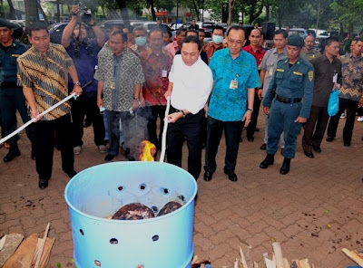 Jakarta, Pushumas. Sebanyak 12.677 kilogram barang bukti trenggiling dan 95,96 Kg sisik trenggiling secara simbolis dimusnahkan oleh Menteri Kehutanan bersama Bareskrim Mabes Polri dan Jampidum Kejaksaan Agung di halaman Kantor Kementerian Kehutanan Jakarta, Jumat(15/6).