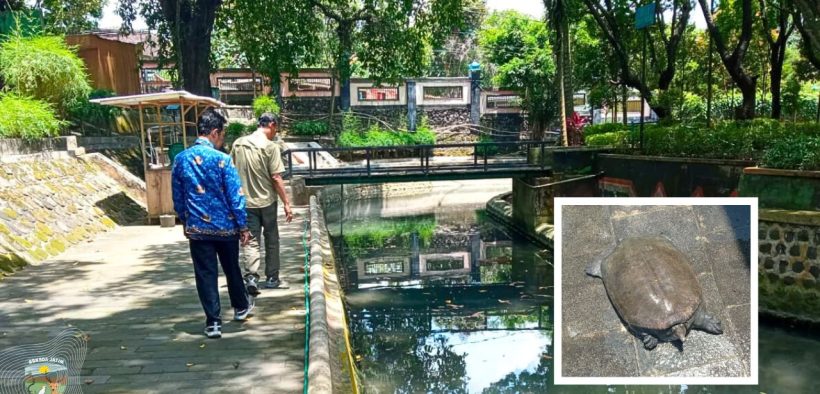 Ngawi – Di permukaan air yang tenang di Taman Wisata Tawun, Kabupaten Ngawi, sesekali tampak riak kecil yang memecah bayangan pepohonan di sekeliling kolam. Dari dasar perairan itu, seekor satwa bergerak perlahan, tubuhnya pipih, bercangkang lunak dengan warna cokelat keabu-abuan dan bintik-bintik samar.