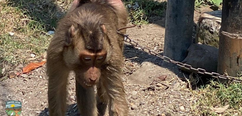 Di bawah terik matahari, seekor beruk (Macaca nemestrina) menatap kosong, terikat pada sebuah tiang besi di tepi jalan raya Desa Tonjung Burneh, Bangkalan. Tubuhnya dirantai, tanpa naungan, tanpa kandang, dan dikelilingi tumpukan sampah. Hanya sesekali tangan manusia yang peduli menyodorkan makanan seadanya. Di balik tatapan matanya yang sayu, tersimpan kisah panjang tentang luka, penelantaran, dan perjuangan hidup satwa liar yang seharusnya bebas di rimba tropis.