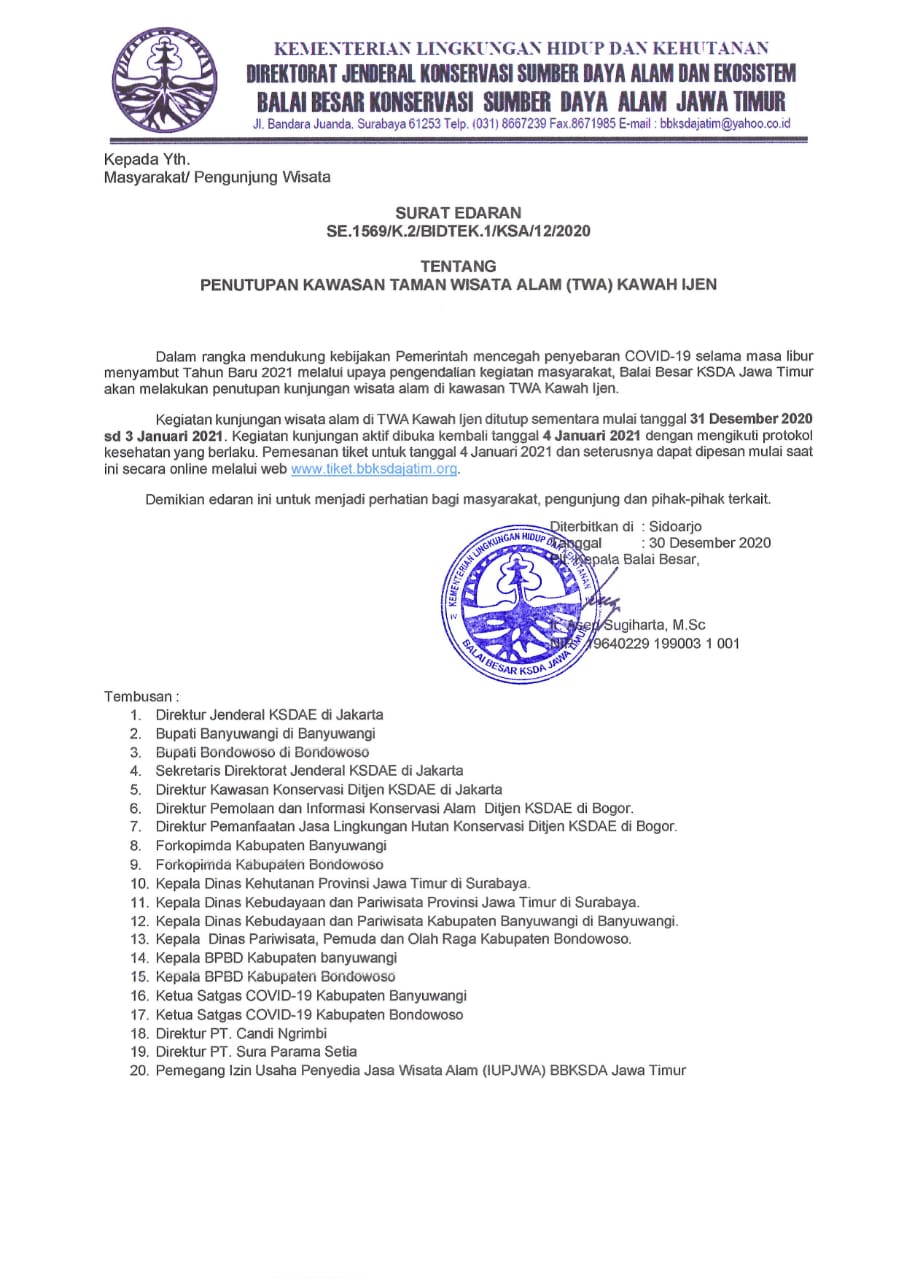 Salam sehat selalu sobat hijau, dengan mempertimbangkan berbagai aspek, kondisi dan merujuk pada surat edaran pemerintah Kabupaten Bondowoso serta surat tim gugus tugas penanganan covid-19 Kabupaten Banyuwangi, terhitung mulai tanggal 30 Desember 2020 s/d 3 Januari 2021 TWA Kawah Ijen ditutup dulu ya. Jika tidak hal yang menghadang, TWA Kawah Ijen ditutup dulu ya. Jika tidak hal yang menghadang, TWA Kawah Ijen akan dibuka kembali dan siap menyambut kalian pada tanggal 4 Januari 2021. Tahun baru lebih aman dirumah saja dulu, gak kalah berkesannya kok momen tahun baru dirumah kumpul bersama keluarga yang kita sayangi.