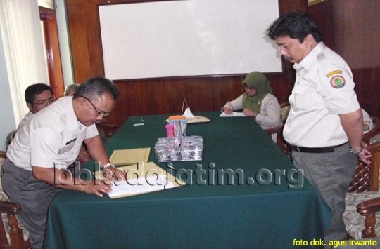 SIDOARJO, bbksdajatim.org – Kepala Bidang Teknis KSDA, Ir. Dadang Wardhana, M.Sc. menyerahkan jabatan Kepala Seksi Perlindungan, Pengawetan, dan Perpetaan kepada Agus Arianto, S.Hut, Selaku pejabat yang baru. Acara tersebut berlangsung secara sederhana di Ruang Rapat Kepala Balai pada hari Senin 22 Oktober 2012.